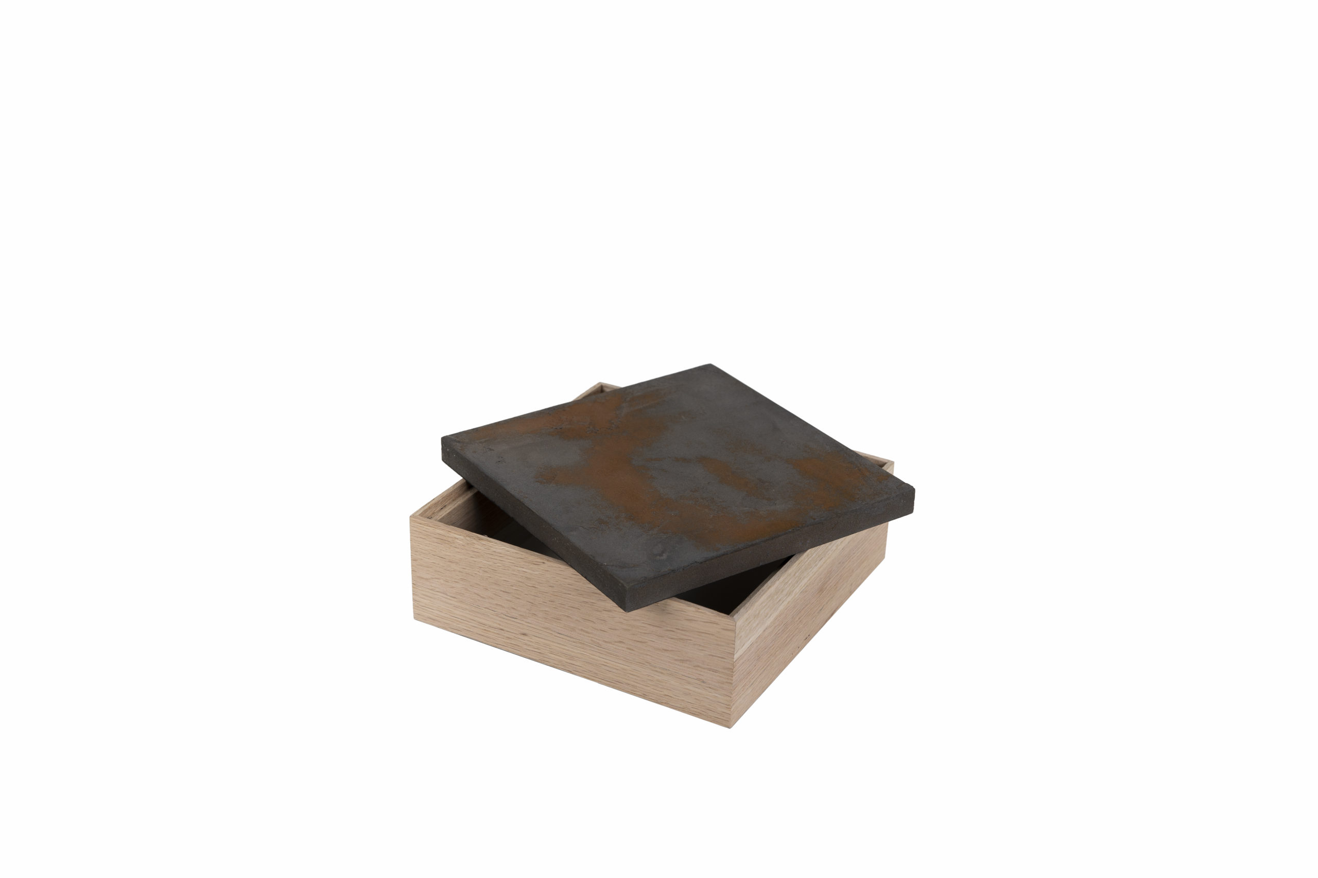 Caja de madera de roble con tapa superpuesta e intercambiable.