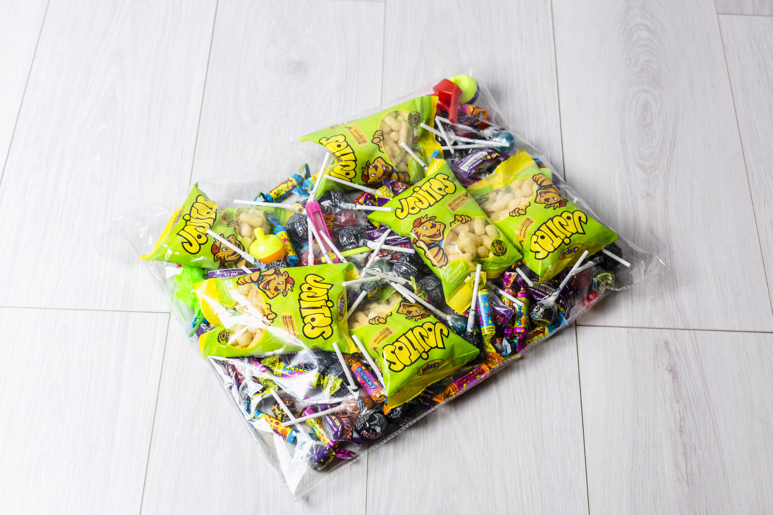 Bolsa de 8 unidades: arroz inflado, palote, escalofrio, fizzroll, dip-lik, caramelo jelly, gominola  y melón chicle.